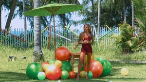 Die schönen eingeölten braungebrannten Beine und dazu ein leicht nippeliger Anblick im zweiten Outfit sind schon sehenswert.
